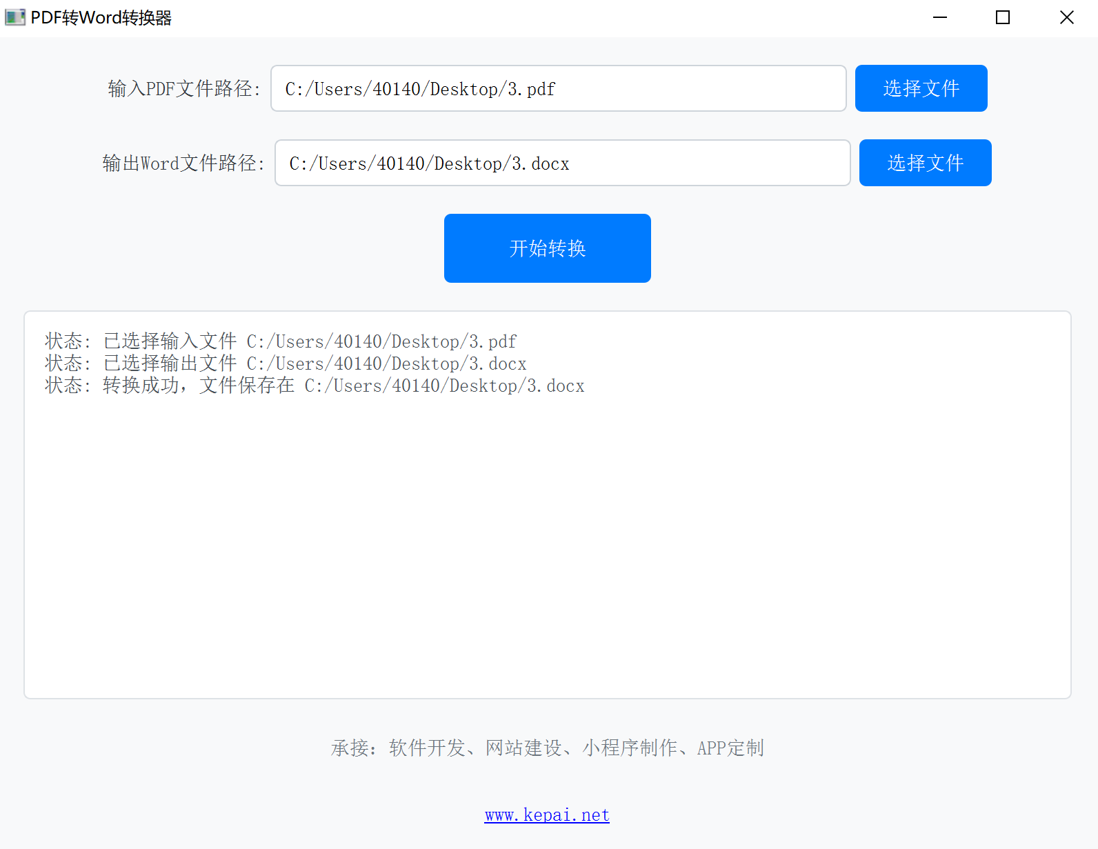 開始轉(zhuǎn)換:點擊“開始轉(zhuǎn)換”按鈕后,程序會調(diào)用pdf2docx庫將選定的PDF文件轉(zhuǎn)換為Word文檔,并在狀態(tài)欄中顯示轉(zhuǎn)換進度和結(jié)果。